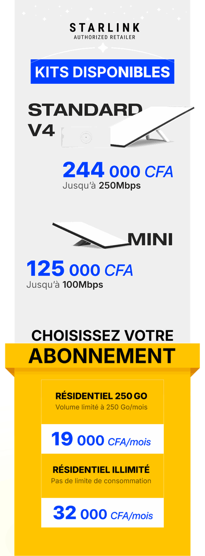 Kit Internet par satellite nouvelle génération pour une connexion haut débit, même en zones rurales. Installation simple avec antenne et routeur Wi-Fi inclus. Conçu pour offrir stabilité et faible latence dans toutes les conditions climatiques.